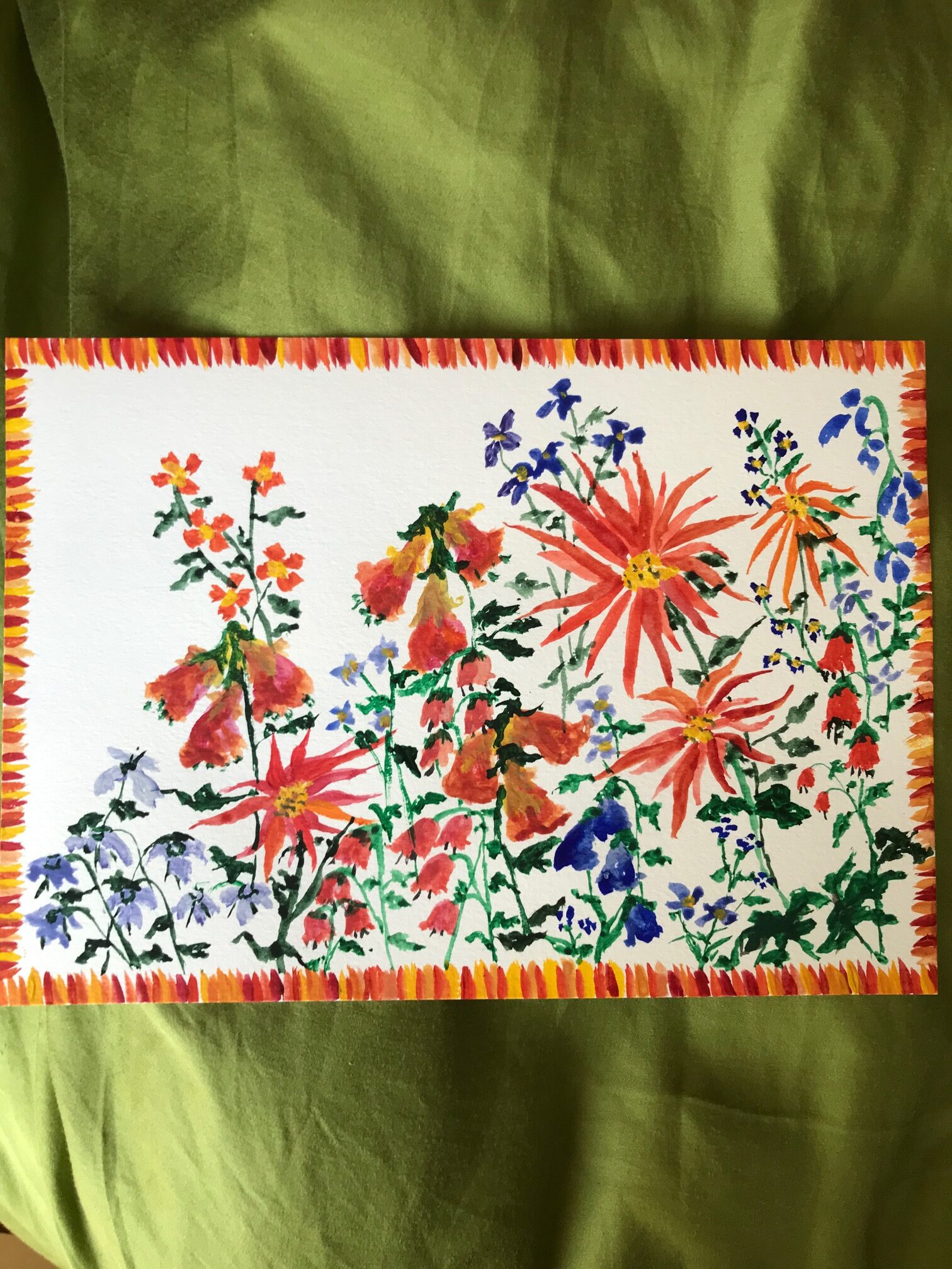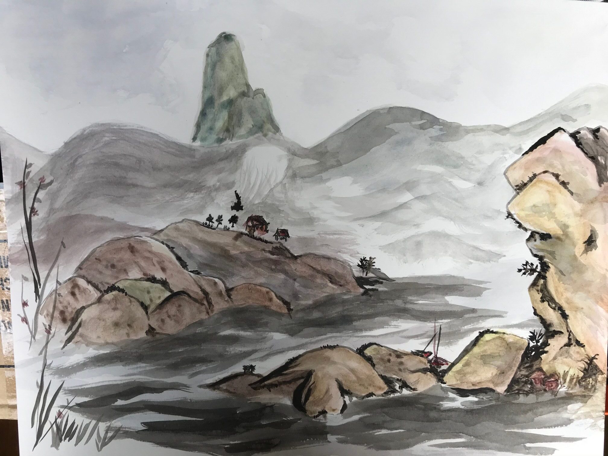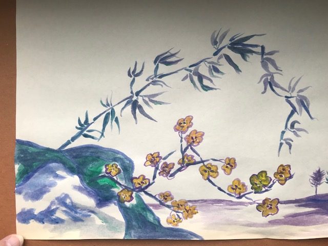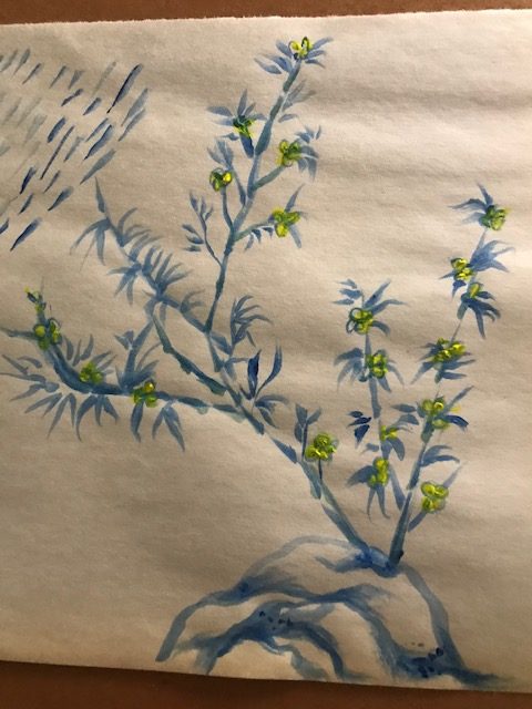 I dance a lot, and one of the teachers of a dance class I take is Chinese and teaches Chinese painting, so I said I wanted to learn from him and he said okay and set up a Zoom class back in early spring. We meet weekly. I knew nothing about Chinese painting. I was an oil painter and also worked in acrylics, so working with watercolors is something I did not have much familiarity with. But at home I don’t have the space to do a big oil painting or make a big mess, so I decided watercolor is a good idea. What I’ve been sending you is sort of Chinese painting; I take off and do my own thing with it. When I do landscape I add a little color because with Chinese painting a landscape has very little color. It’s almost all black and white with just a little hint of color, and I find that a little frustrating because I love color.