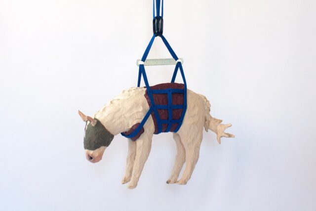Wren MacDonald, “Forest Fire,” 2025, 14″ x 6″ x 10″, stoneware, colored slip, nylon, hardware. Image: courtesy of the artist.
