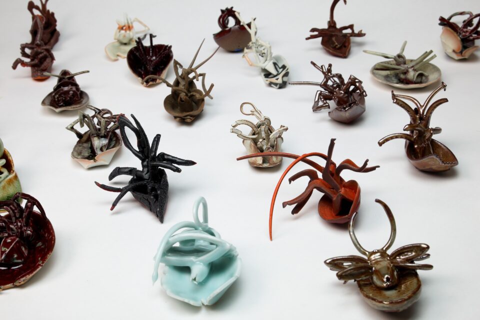 “I am interested in using clay as a vehicle to explore issues of idealized beauty, vanity and the subjugation of the female body using porcelain as my primary media, a material inextricably linked to secrecy, desire and commodification. I create figurative-based sculptures that are often partially masked, covered or unseen; calling viewers to witness these haunting works, including bodies contorted in marred, embellished form. From Marie Antoinette’s breast cup to the Venus of Willdendorf, my work evokes forms and objectsof the past, creating compelling ceramic sculptures that takes lineage from the vast history of the female body articulated in clay.” – Jessica Stoller