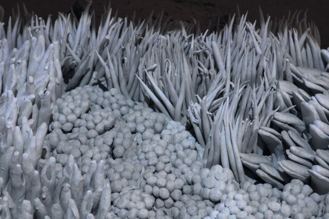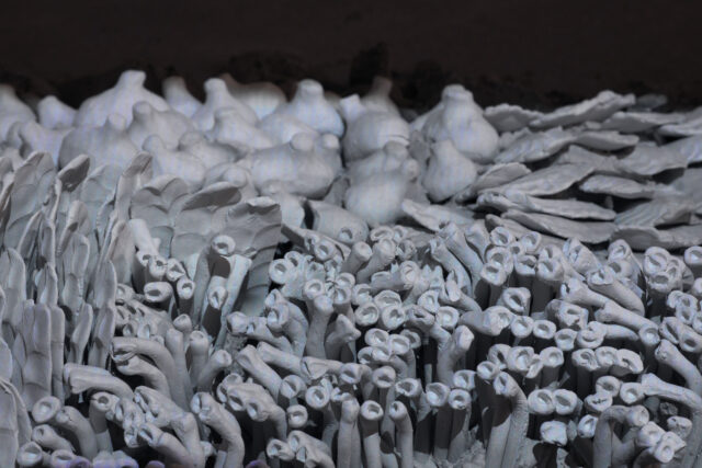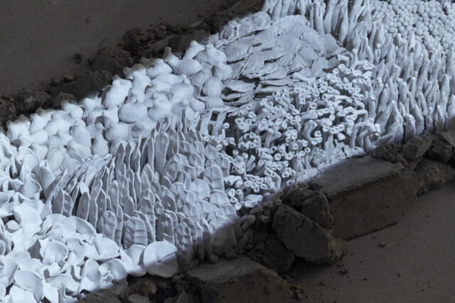 Rachel Eng, “Deliberate Pace” (detail), porcelain, concrete, projection, sound, 2022. Image: Alan Wiener, courtesy Greenwich House Pottery 2022.