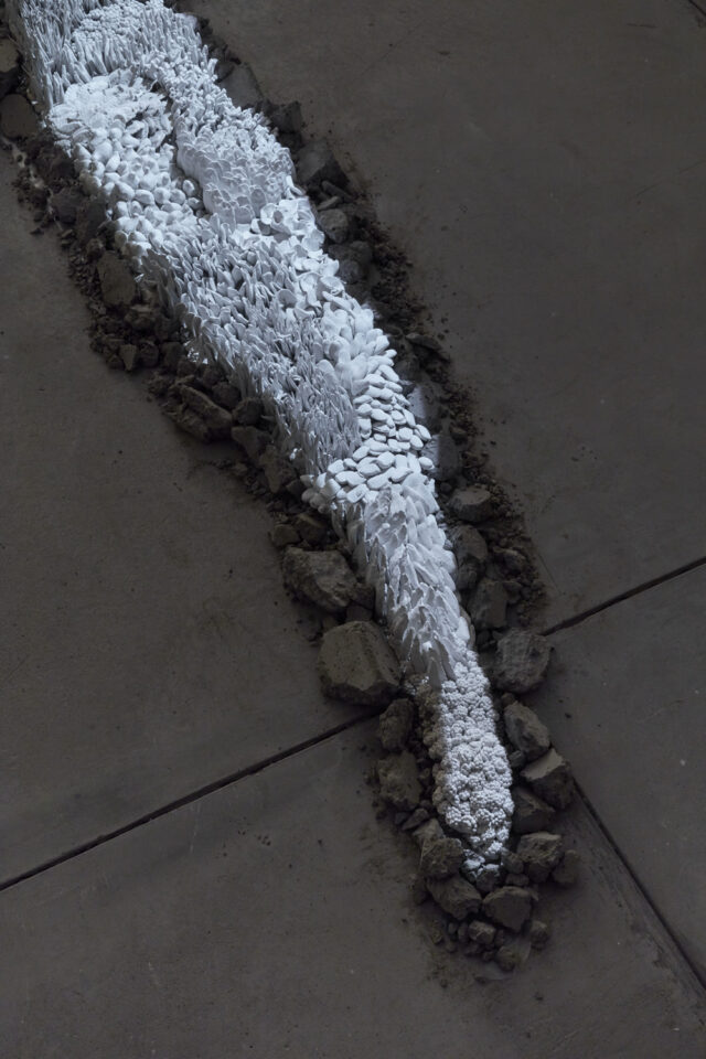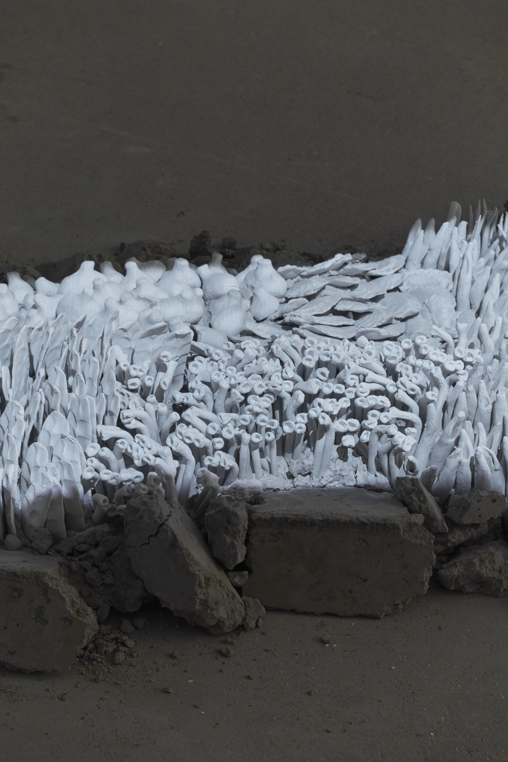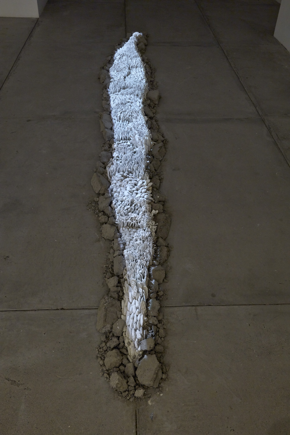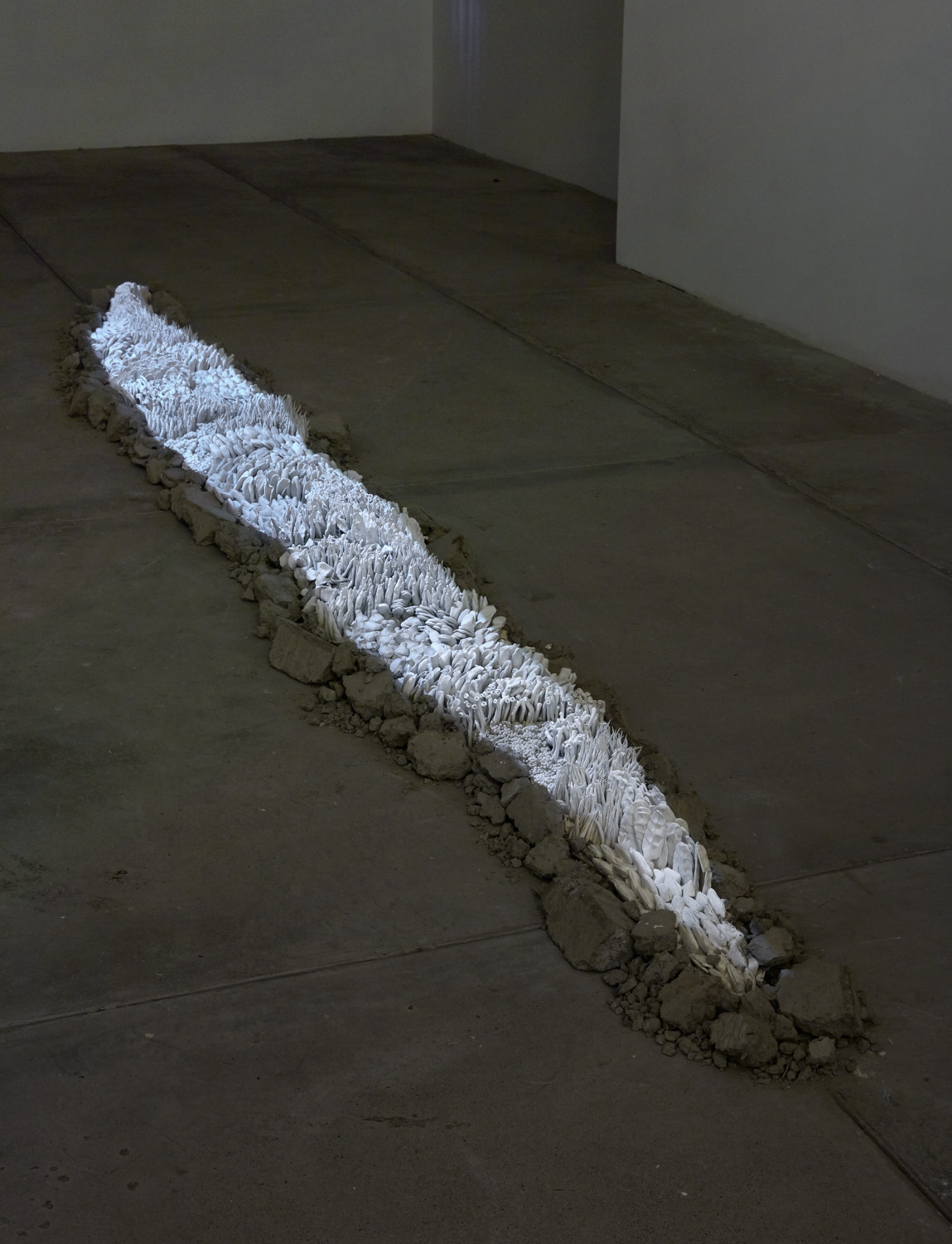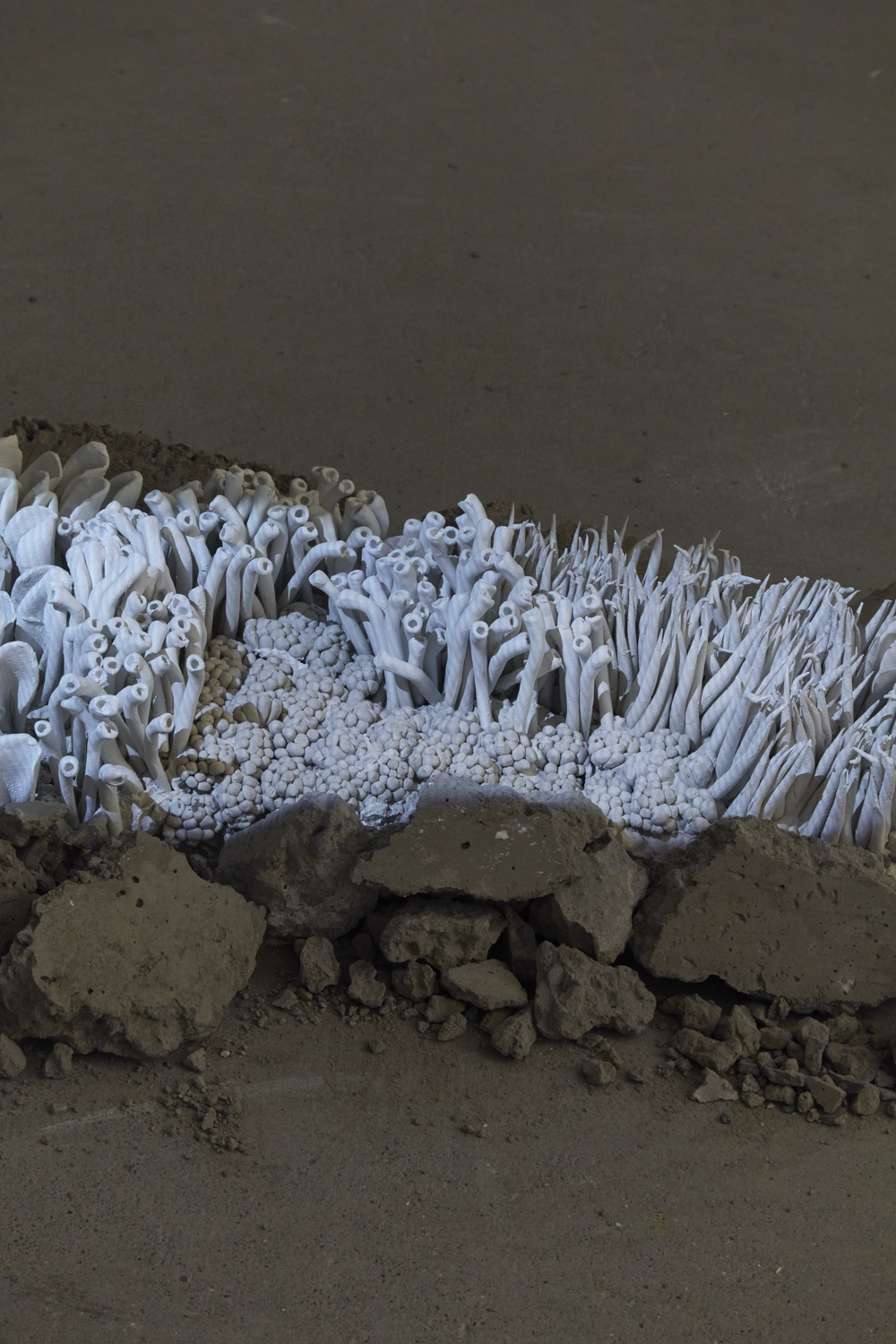 The Jane Hartsook Gallery is pleased to present Rachel Eng’s New York City solo show debut. In this installation, Eng has ripped a hole in time, creating a “fissure” in the gallery floor that she has filled with forms referencing Ediacaran fauna modeled out of raw clay. These soft-bodied organisms lived on Earth 635 million years ago. By bringing these ancient lifeforms into the present day, Eng invites viewers to contemplate the vastness of geological time and puts humanity’s relatively short existence into perspective. Ediacaran fauna emerged just before the Cambrian explosion, a massive proliferation and diversification of life on Earth. These organisms were unique in that they used and recycled the resources around them, existing in an ecosystem in which organisms were neither predator nor prey. By creating her Ediacaran fauna out of raw clay that she will recycle at the end of the exhibition, Eng considers the ephemerality of all living things and how we could learn from both human and non-human regenerative processes.