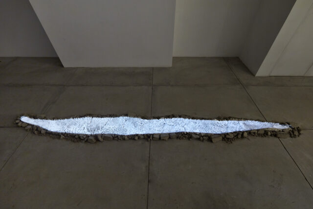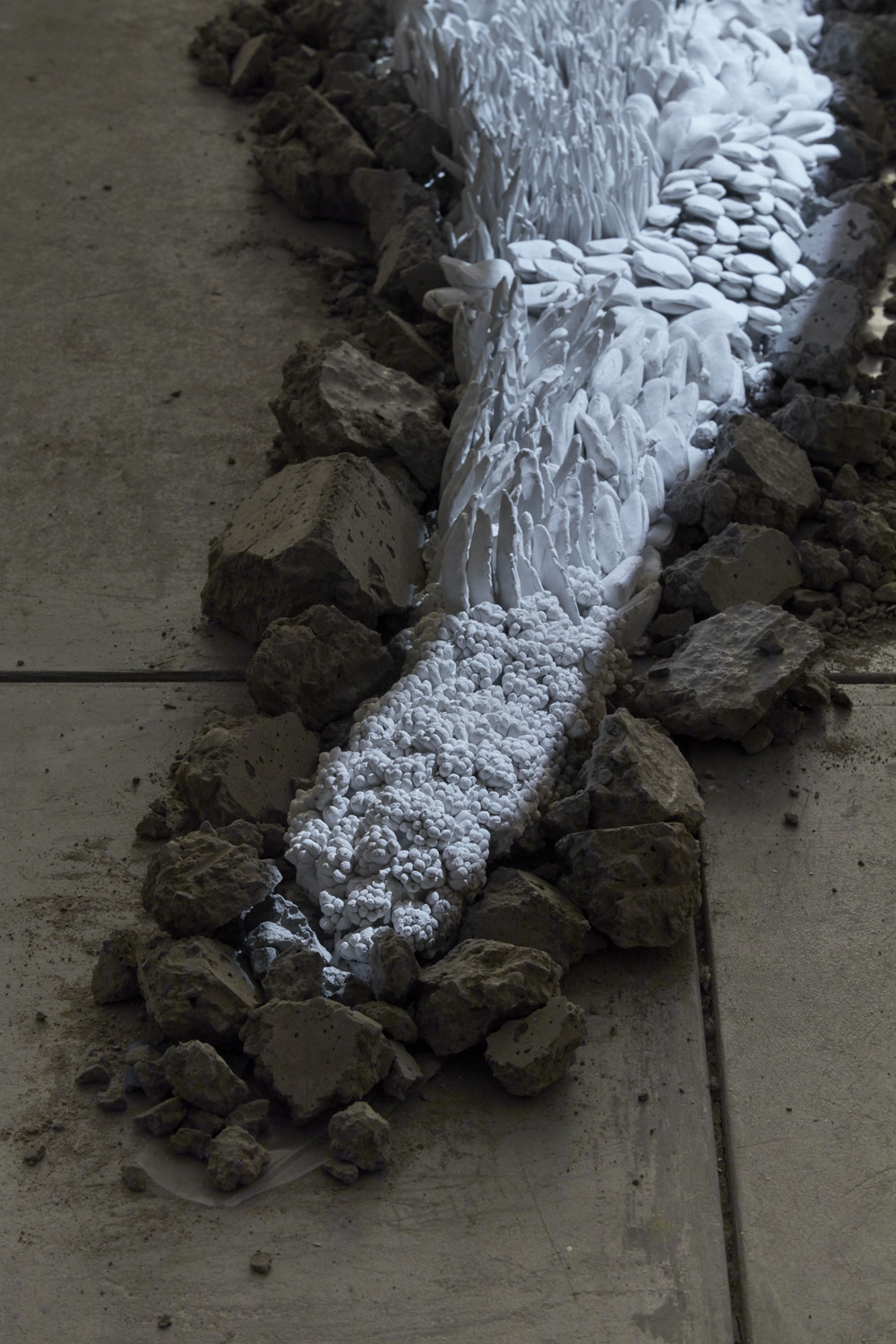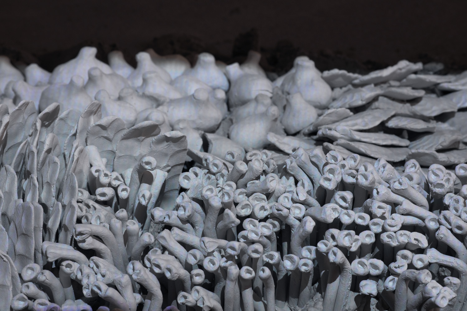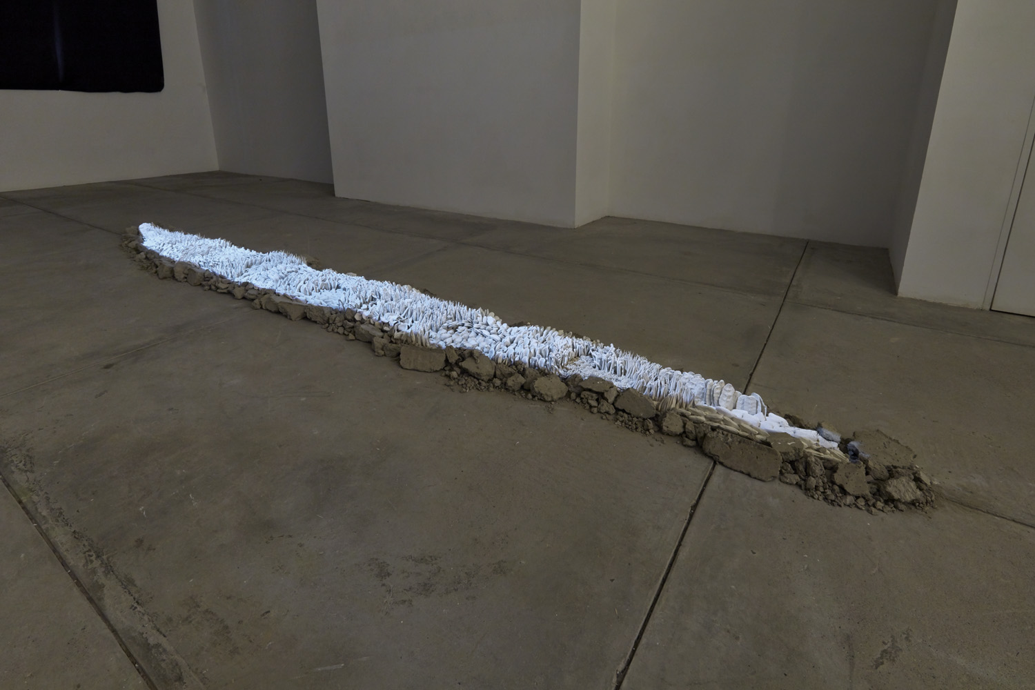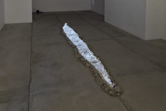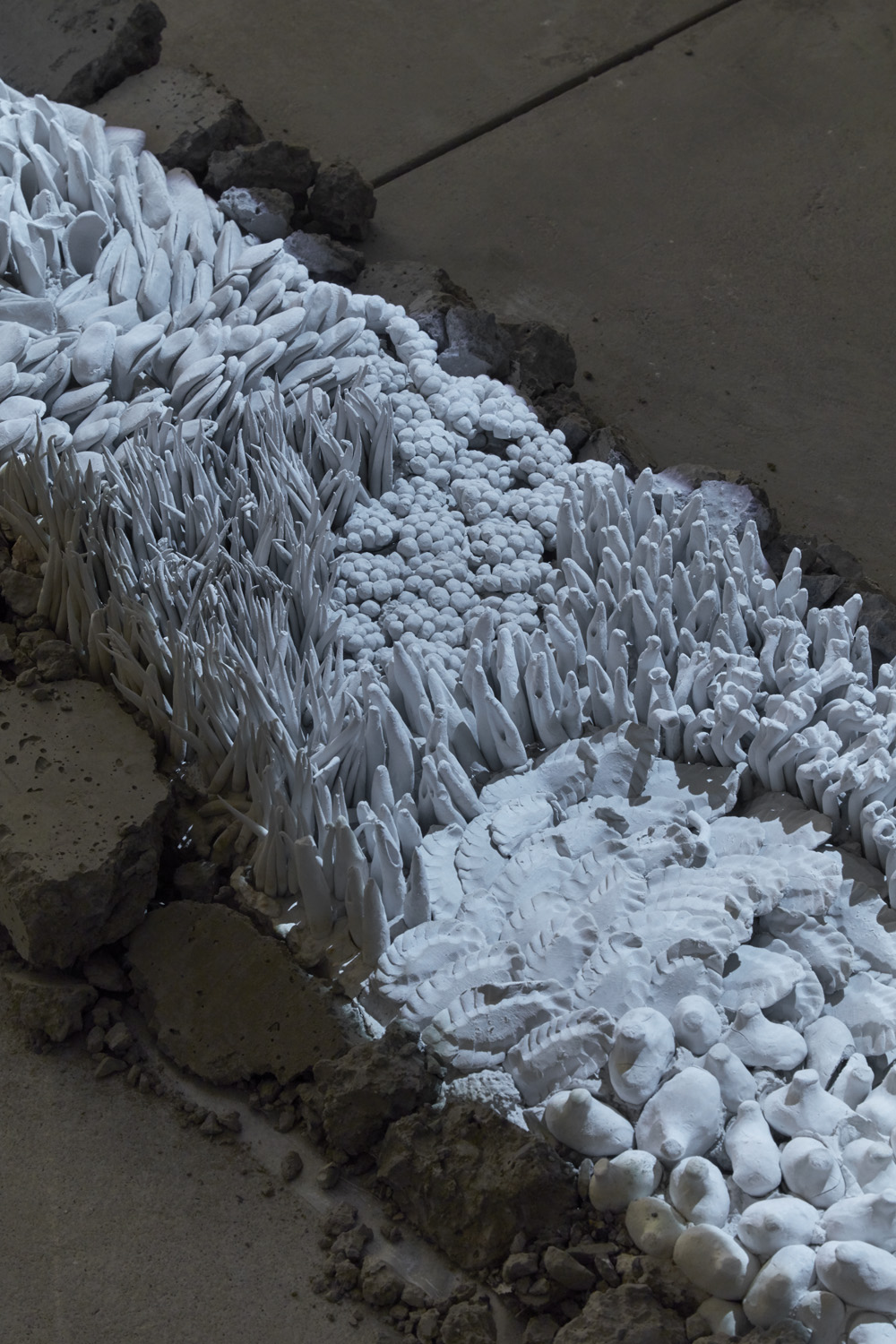 The Jane Hartsook Gallery is pleased to present Rachel Eng’s New York City solo show debut. In this installation, Eng has ripped a hole in time, creating a “fissure” in the gallery floor that she has filled with forms referencing Ediacaran fauna modeled out of raw clay. These soft-bodied organisms lived on Earth 635 million years ago. By bringing these ancient lifeforms into the present day, Eng invites viewers to contemplate the vastness of geological time and puts humanity’s relatively short existence into perspective. Ediacaran fauna emerged just before the Cambrian explosion, a massive proliferation and diversification of life on Earth. These organisms were unique in that they used and recycled the resources around them, existing in an ecosystem in which organisms were neither predator nor prey. By creating her Ediacaran fauna out of raw clay that she will recycle at the end of the exhibition, Eng considers the ephemerality of all living things and how we could learn from both human and non-human regenerative processes.