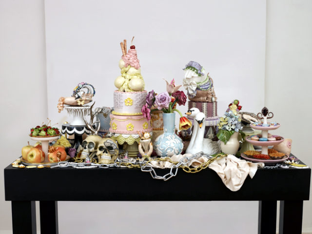 “I am interested in using clay as a vehicle to explore issues of idealized beauty, vanity and the subjugation of the female body using porcelain as my primary media, a material inextricably linked to secrecy, desire and commodification. I create figurative-based sculptures that are often partially masked, covered or unseen; calling viewers to witness these haunting works, including bodies contorted in marred, embellished form. From Marie Antoinette’s breast cup to the Venus of Willdendorf, my work evokes forms and objectsof the past, creating compelling ceramic sculptures that takes lineage from the vast history of the female body articulated in clay.” – Jessica Stoller
