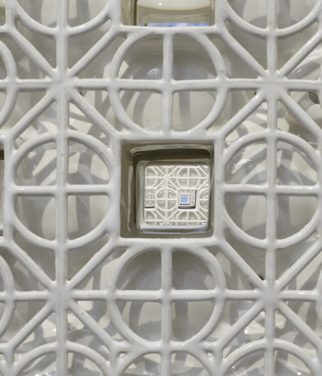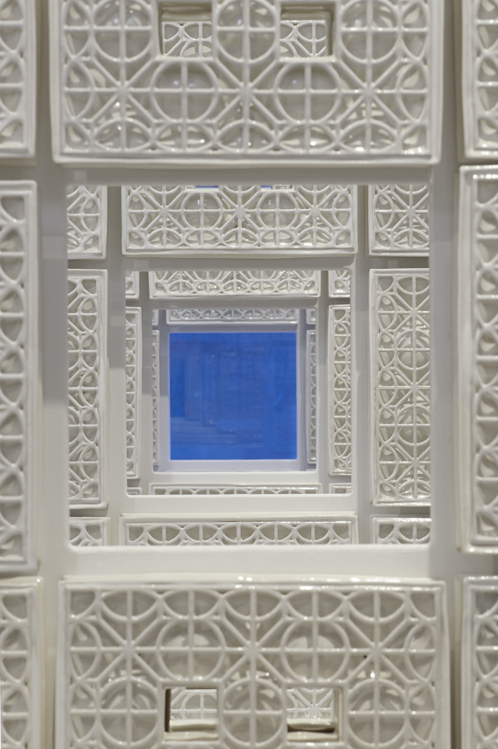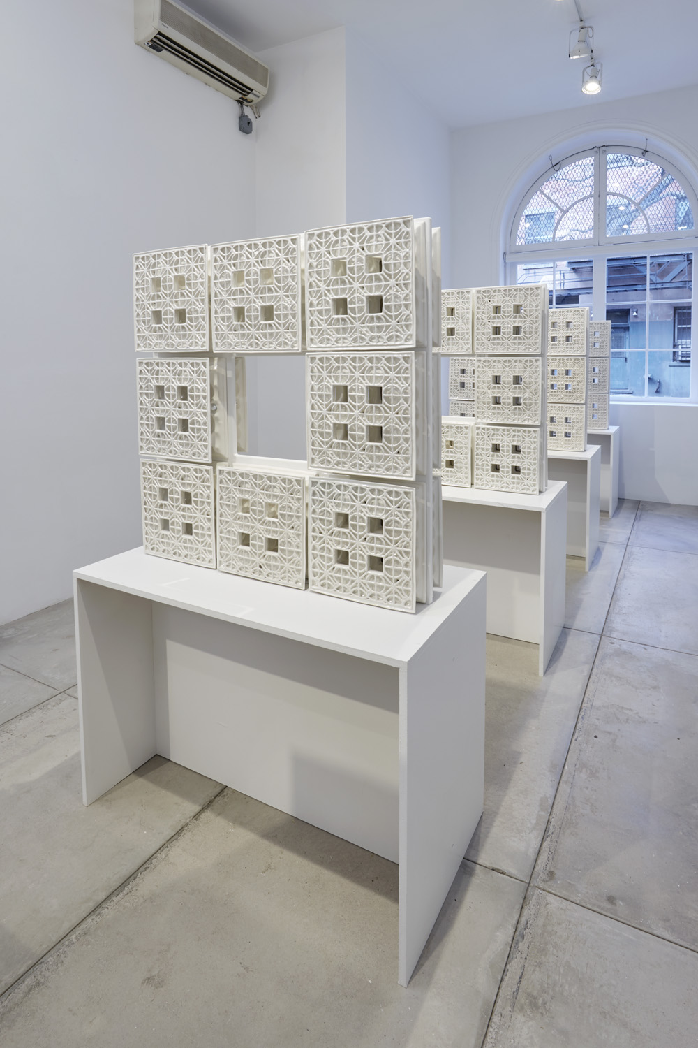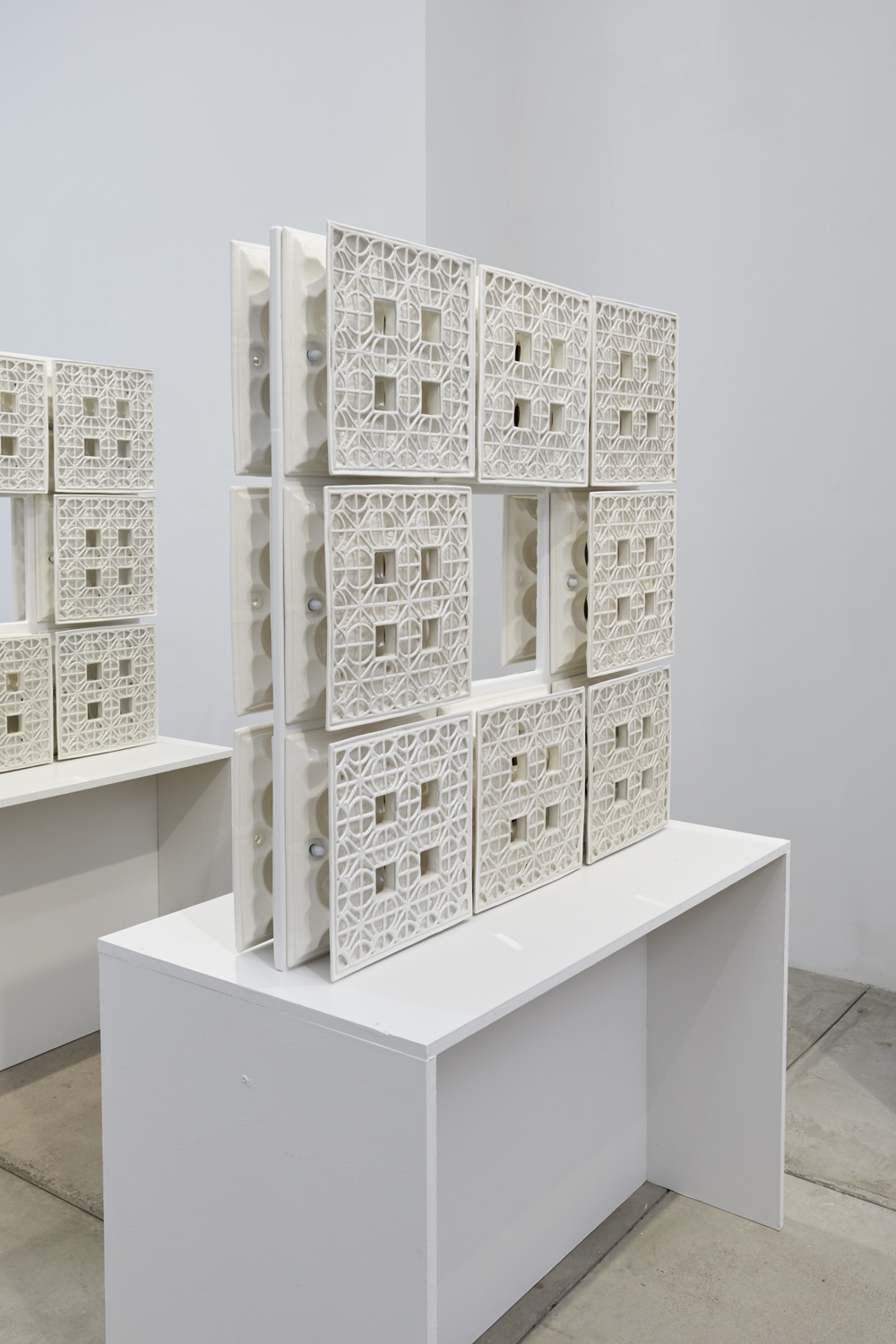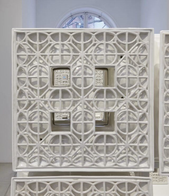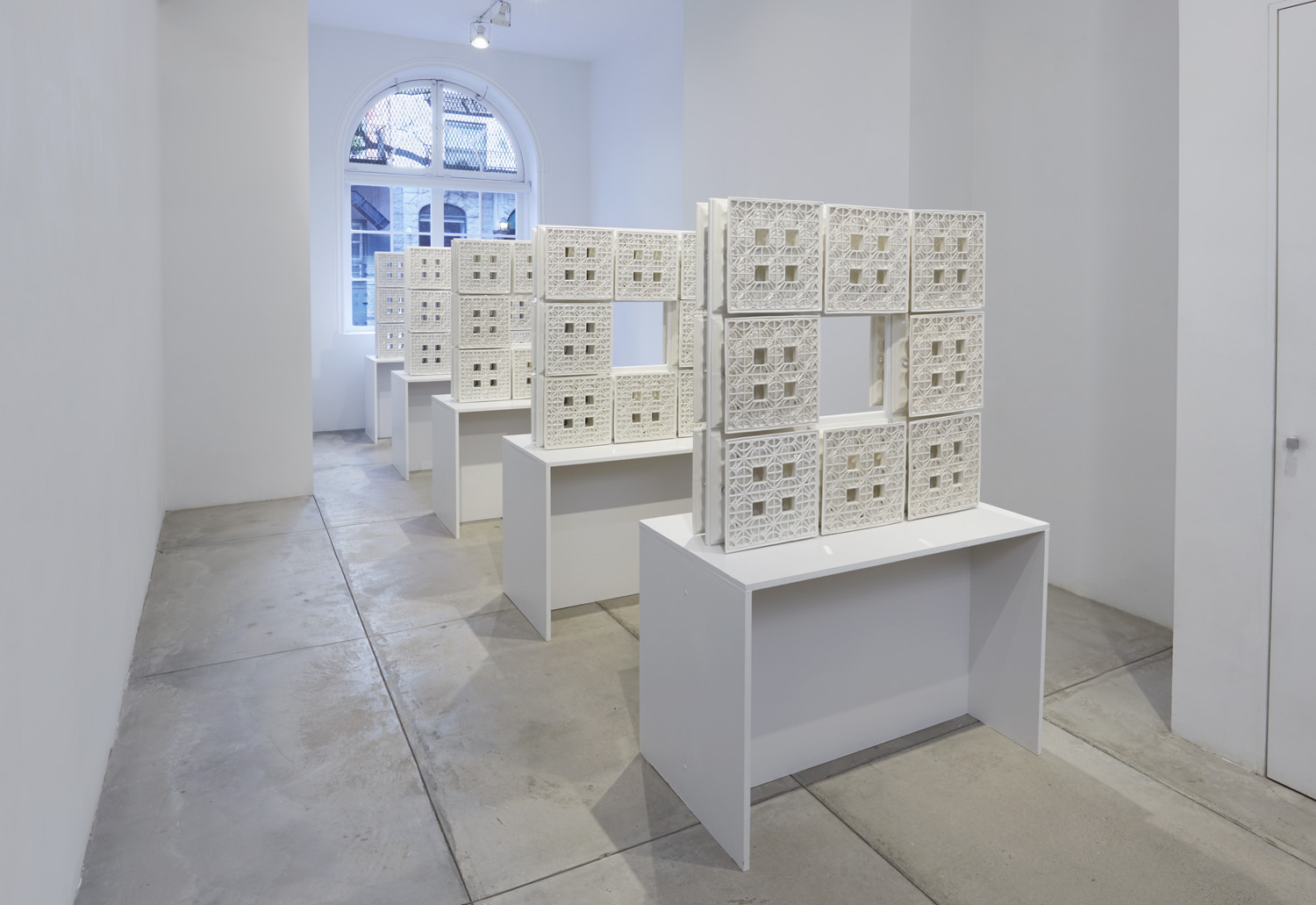 The Jane Hartsook Gallery is pleased to present Eliza Au’s first solo exhibition in New York City. Au’s installation consists of a series of ceramic lattice screens, which use ornament and repetition to reexamine sacred space. She uses computer-aided design (CAD) to create repeated abstract patterns that she translates into clay, constructing forms that evoke architectural units like bricks, tiles, and pillars to inspire a sense of meditative rhythm. The finished ceramic works are a physical manifestation of the computer-based wireframe in which structure and ornament become inseparable. Their composition is so detailed that the negative space defines the work as much as the positive space, creating a compelling duality of form that, along with the structure’s abstract patterning, creates a window into a calmer world.