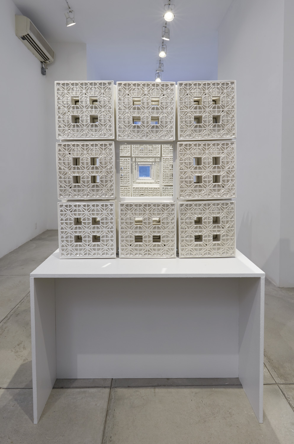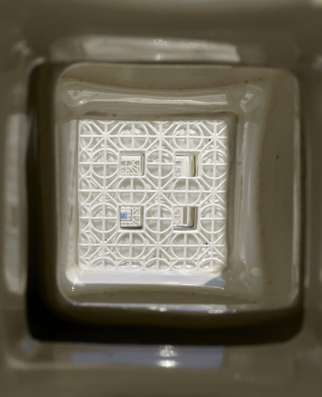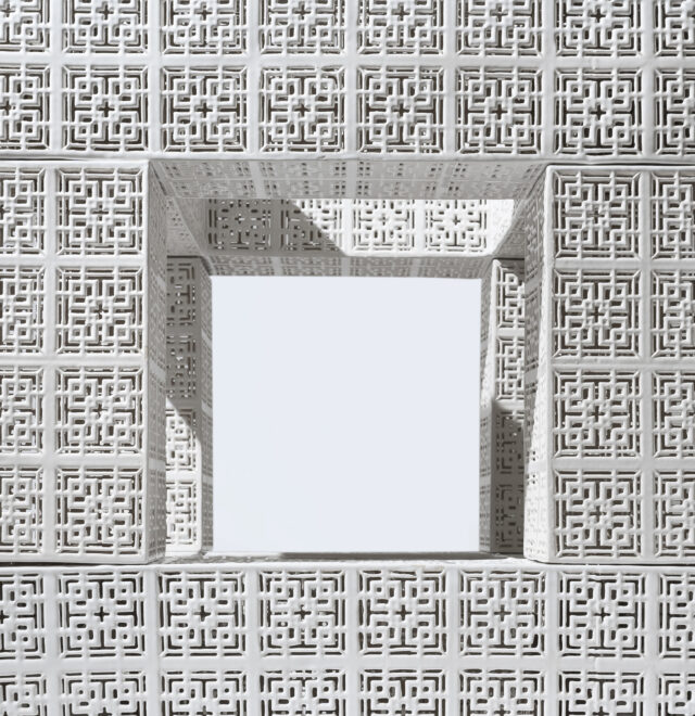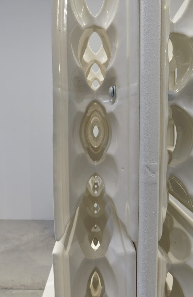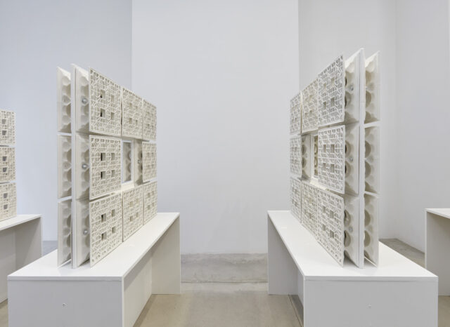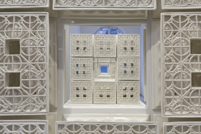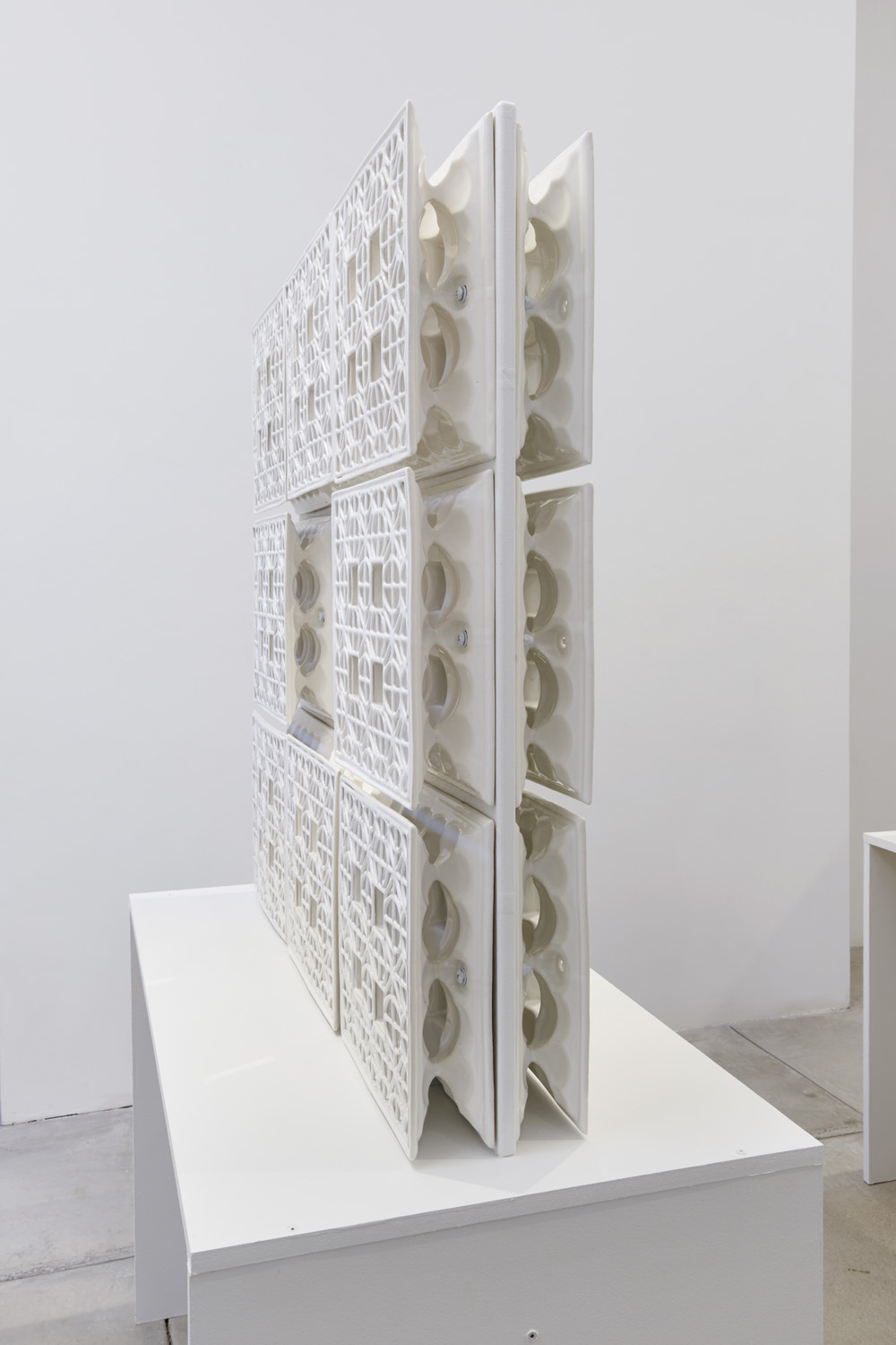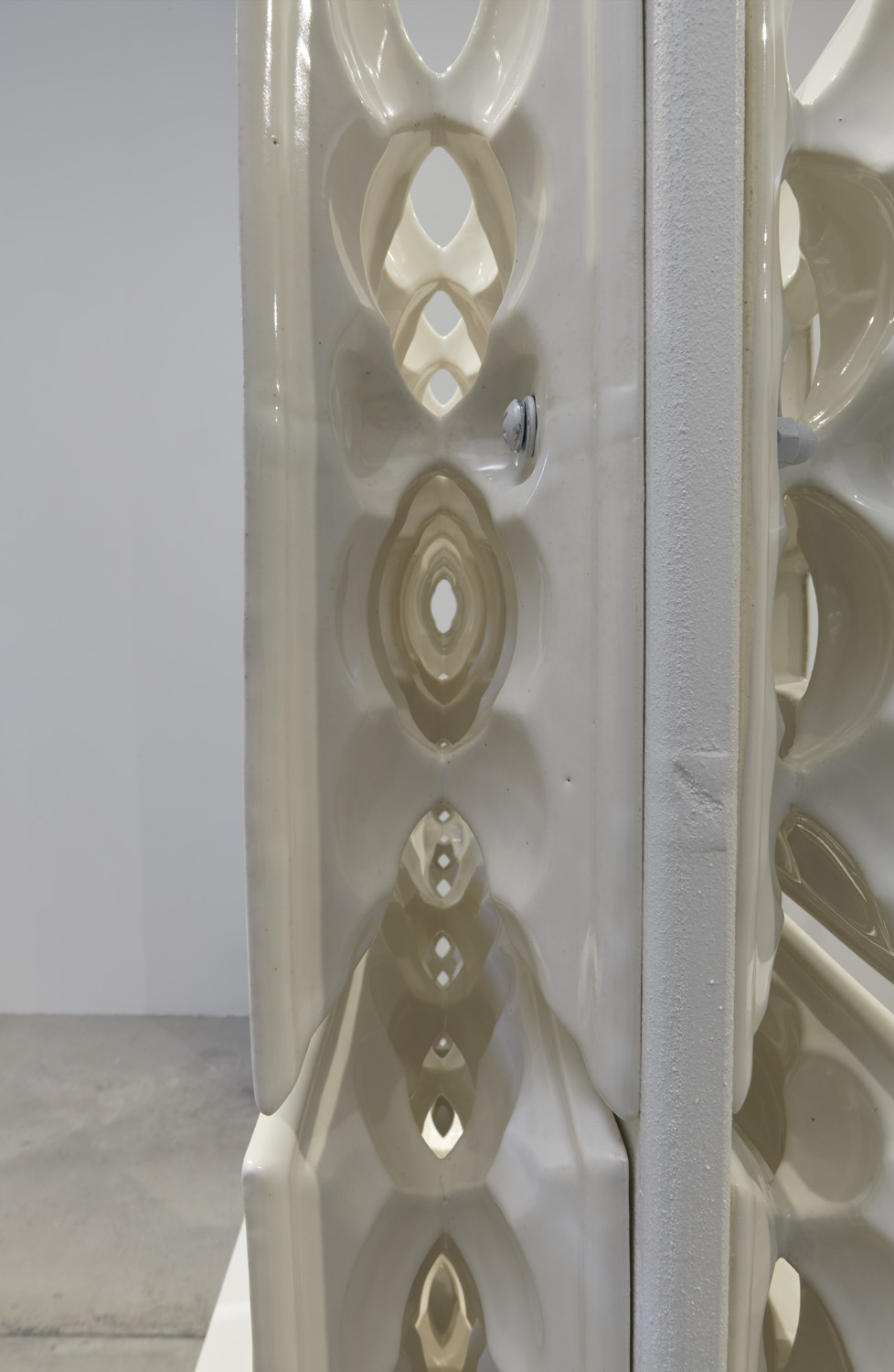 The Jane Hartsook Gallery is pleased to present Eliza Au’s first solo exhibition in New York City. Au’s installation consists of a series of ceramic lattice screens, which use ornament and repetition to reexamine sacred space. She uses computer-aided design (CAD) to create repeated abstract patterns that she translates into clay, constructing forms that evoke architectural units like bricks, tiles, and pillars to inspire a sense of meditative rhythm. The finished ceramic works are a physical manifestation of the computer-based wireframe in which structure and ornament become inseparable. Their composition is so detailed that the negative space defines the work as much as the positive space, creating a compelling duality of form that, along with the structure’s abstract patterning, creates a window into a calmer world.
