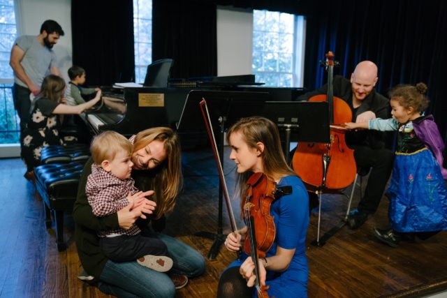 Mozart for Munchkins creates a relaxed, interactive, and engaging environment where children and their families can experience and enjoy the wonders of classical, jazz, bluegrass, and more! Children of all ages are welcome to observe, explore, discover, sing, and dance to their hearts’ content, while parents, grandparents, and caregivers sit back, relax, and enjoy the concert. While our concert setting is informal, the programming remains first-rate; from Bach to Bernstein, Beethoven to bluegrass, and Tchaikovsky to Thelonious Monk, Mozart for Munchkins features outstanding repertoire performed by world-class musicians from Carnegie Hall, Jazz at Lincoln Center, Broadway, and beyond—an unforgettable experience for the whole family! Our interactive concerts include everything from sing-alongs to bubbles to drawing to dancing and clapping (you CAN dance to Bach!)! We always end with our favorite, “instrument petting zoo!”